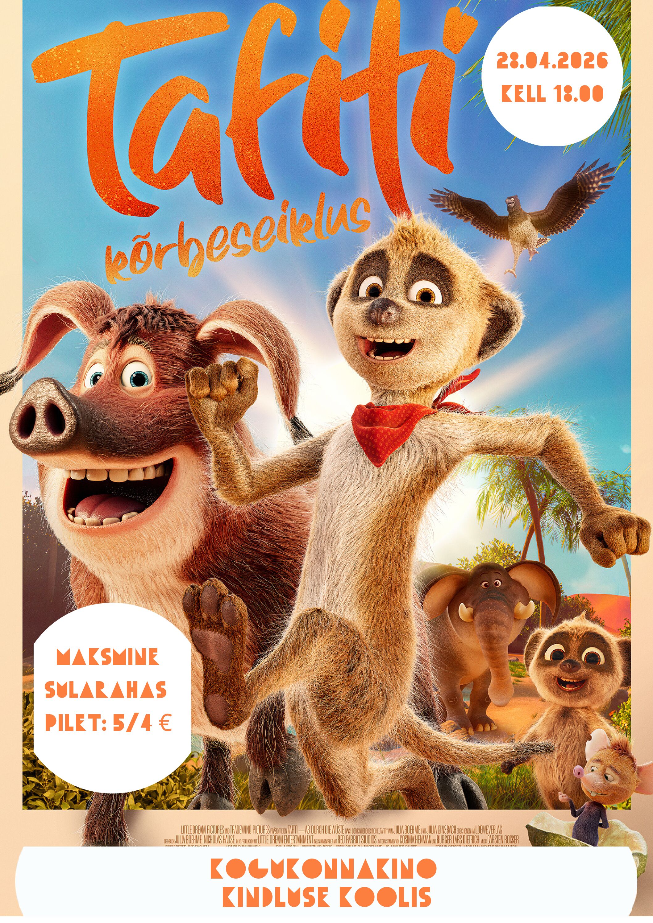 Tule kogukonnakinno Kindluse Koolis! Seekord vaatame filmi “Tafiti kõrbeseiklus”. Kinoseanss algab kell 18.00. Tutvustus: Aafrika savann on ohte täis, eriti veel surikaadile. Tafiti peaks seda ju teadma. Kui ta pere hämminguks Pinseli-nimelise kohmaka jõesea koju toob, leiab aset tragöödia ja mürgimadu nõelab vanaisa. Tafiti asub ta päästmiseks kõrbeseiklusele, et väidetavalt ravivõimetega legendaarne sinine lill leida. Pinsel järgneb talle otsusekindlalt ja neist kahest saavad ohtlikul teekonnal lahutamatud. Vaata treilerit: https://youtu.be/qry2Pc3p_XU?si=6LteheD5vlA2zHls Piletihinnad: täispilet 5 €, sooduspilet 4 € (õpilased, tudengid, pensionärid). Maksmine sularahas kohapeal. Avatud on kohvik! NB! Kindluse Kool ja MTÜ Kindluse Kool juhivad tähelepanu, et kogukonnakino seanssidel viibivate alaealiste eest vastutavad nende [...]